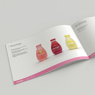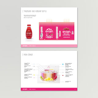 Création de la charte graphique Evian Fruits & Plantes, présentation et normalisation du logotype spécialement créé ainsi que des différents supports PLVs contenant les bouteilles.
