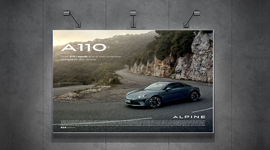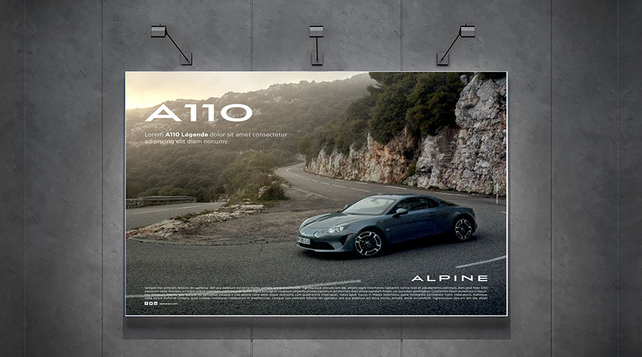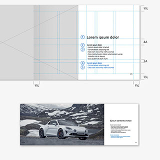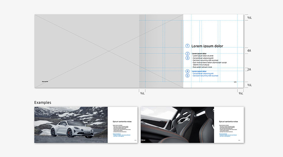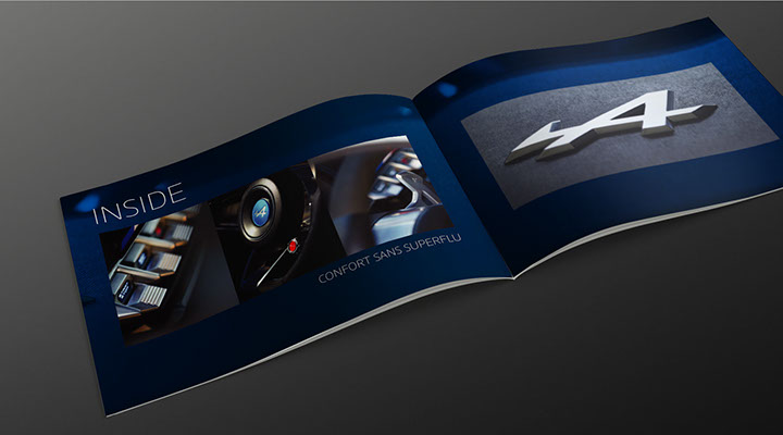 Lors de la seconde évolution du territoire graphique d'Alpine j'ai participé à la création et au développement de l'ensemble des chartes graphiques de la marque (logotype, édition, publicité et événementiel) ainsi que du système graphique des éditions.