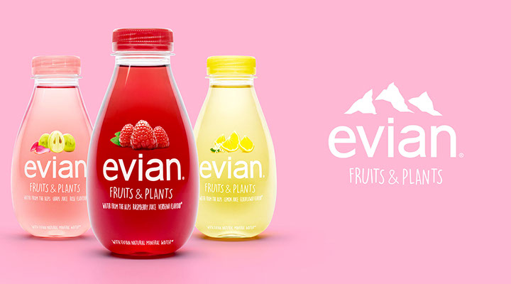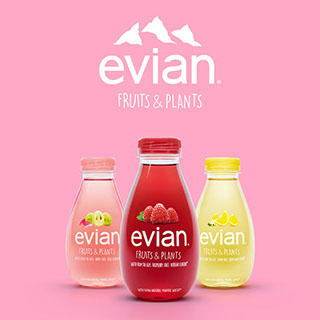 Lancement par Evian d'une gamme de 3 bouteilles aromatisées à base de fruits et de plantes.