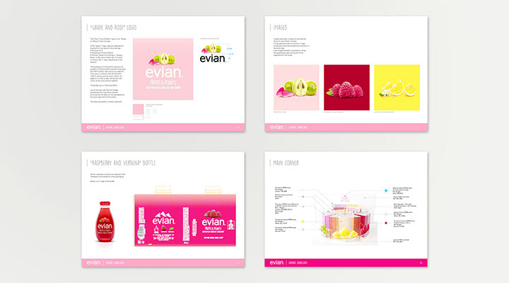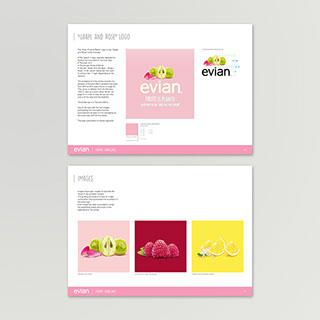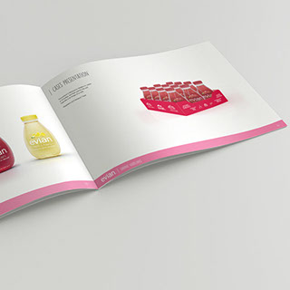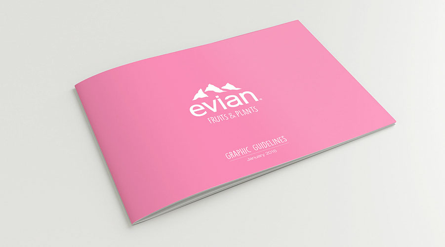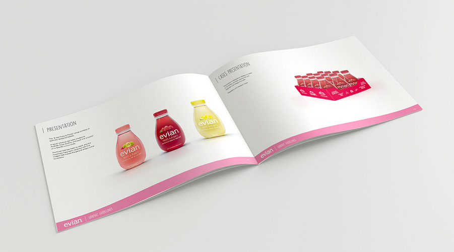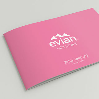 Création de la charte graphique Evian Fruits & Plantes, présentation et normalisation du logotype spécialement créé ainsi que des différents supports PLVs contenant les bouteilles.